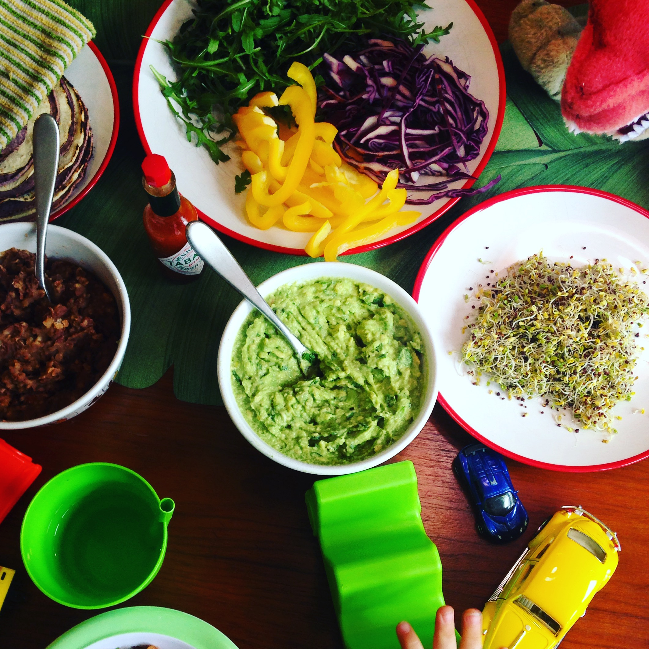 Avocados, limes and lemons are also a Green household staple, so guacamole is almost invariably part of the repertoire. We love our vegetables, squashes, cabbages, sprouts, salad leaves and salad fruits (tomatoes, peppers, etc), and our fresh herbs and spices, such that we generally have something on hand to add a raw element, additional texture and nutrition. We particularly enjoy the colours that are provided by a spectrum of the raw veg. Recently we have used broccoli sprouts, shredded raw red cabbage, fresh courgette sticks, shredded raw beetroot, chopped cherry tomatoes, sliced fresh red and yellow peppers, julienned cucumber, fresh chillies, watercress, rocket, sliced white cabbage, and roasted pumpkin, sweet potato, or butternut squash.