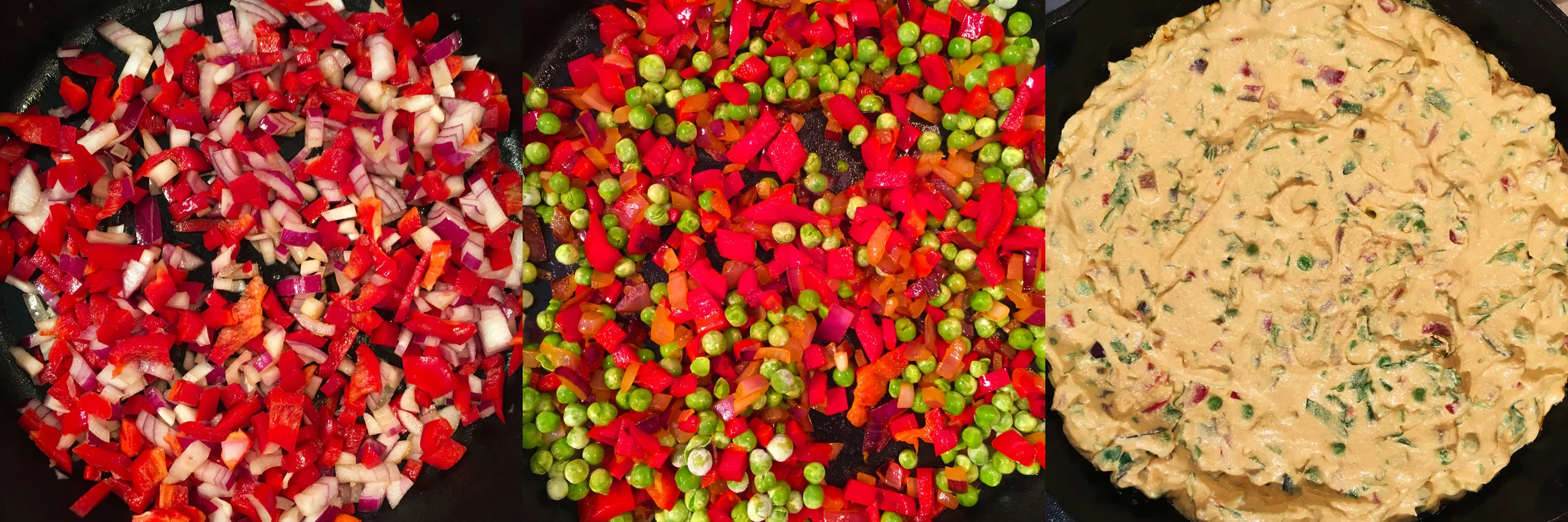 - Dice the onion and red pepper and add along with 1 tsp of salt to an iron skillet or oven-proof pan and saute in the oil for 5 min on medium heat.